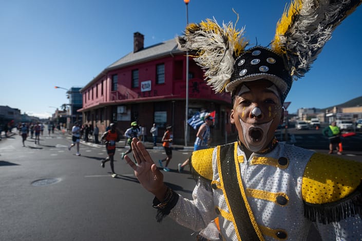 The Gardens section is where the marathon finds its drama. A shaded uphill climb, the longest and steepest of the day, winds through one of Cape Town’s most historic green spaces. But the entertainment here is extraordinary. Protea performers, Xhosa dancers and drummers, a samba band, kids’ marimba bands, African dancing puppets, and a giant meerkat line the route, turning what is the toughest stretch of the race into something genuinely magical to witness. Come here, stay a while, and cheer loudly.