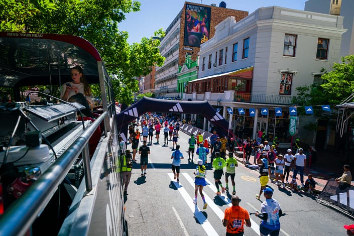 After the climb through the Gardens, runners hit Long Street and begin to fly. The downhill here brings out a different gear in even the most fatigued athletes, and the adidas activation, complete with a live LED screen broadcasting the race and a coffee tuktuk for the crowd, makes this one of the most vibrant viewing spots on the course.